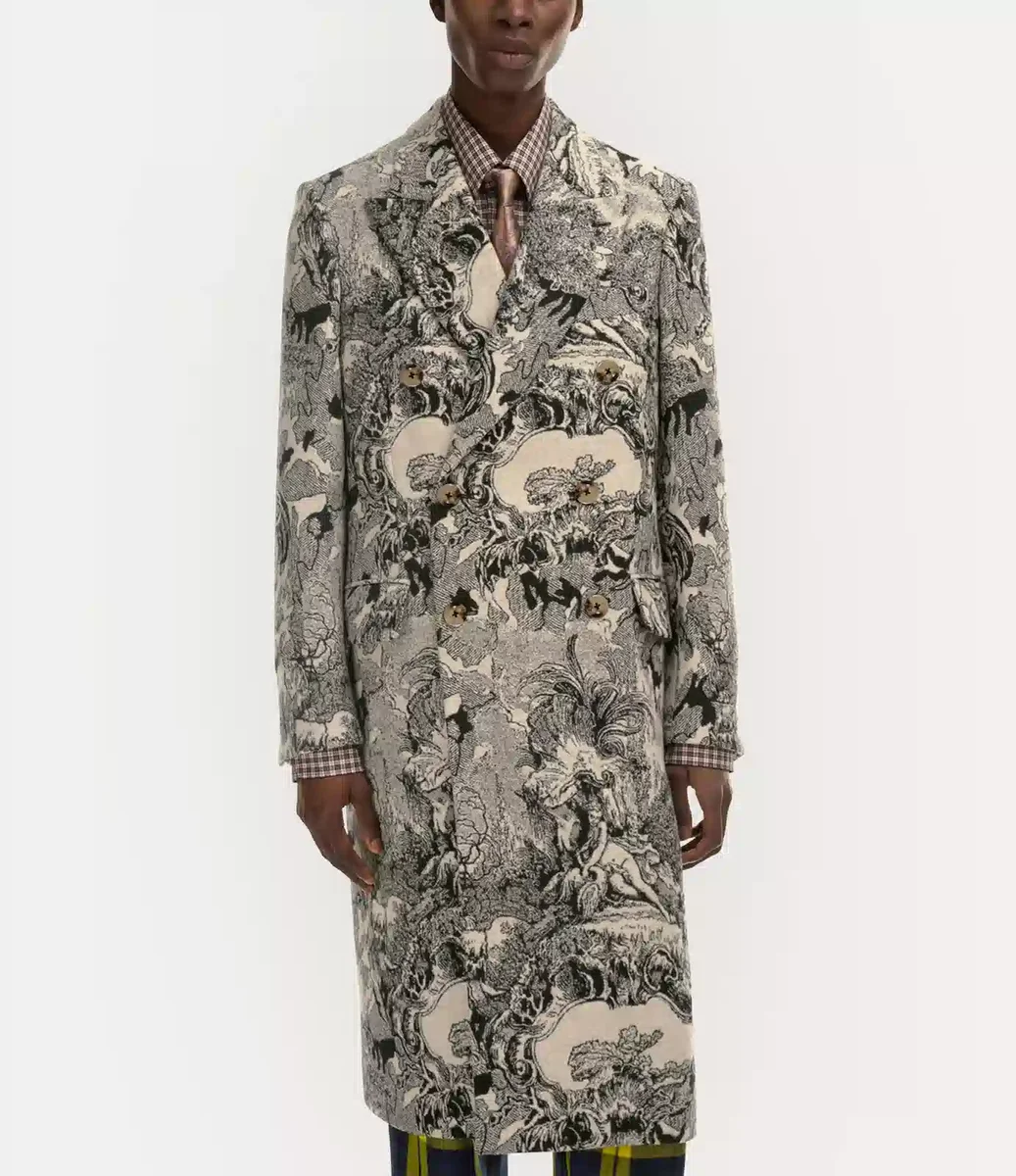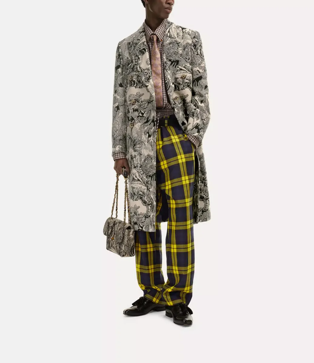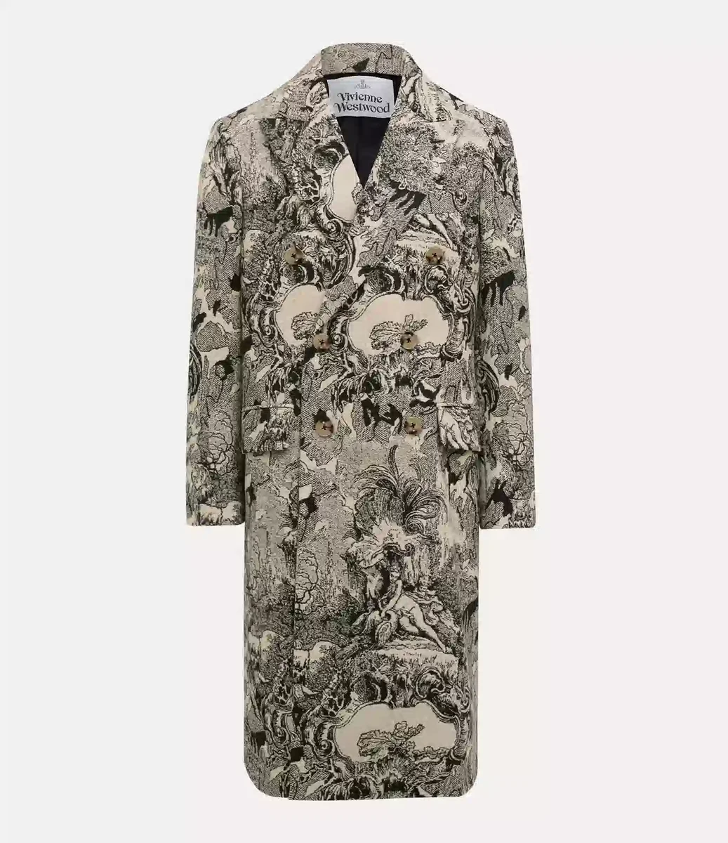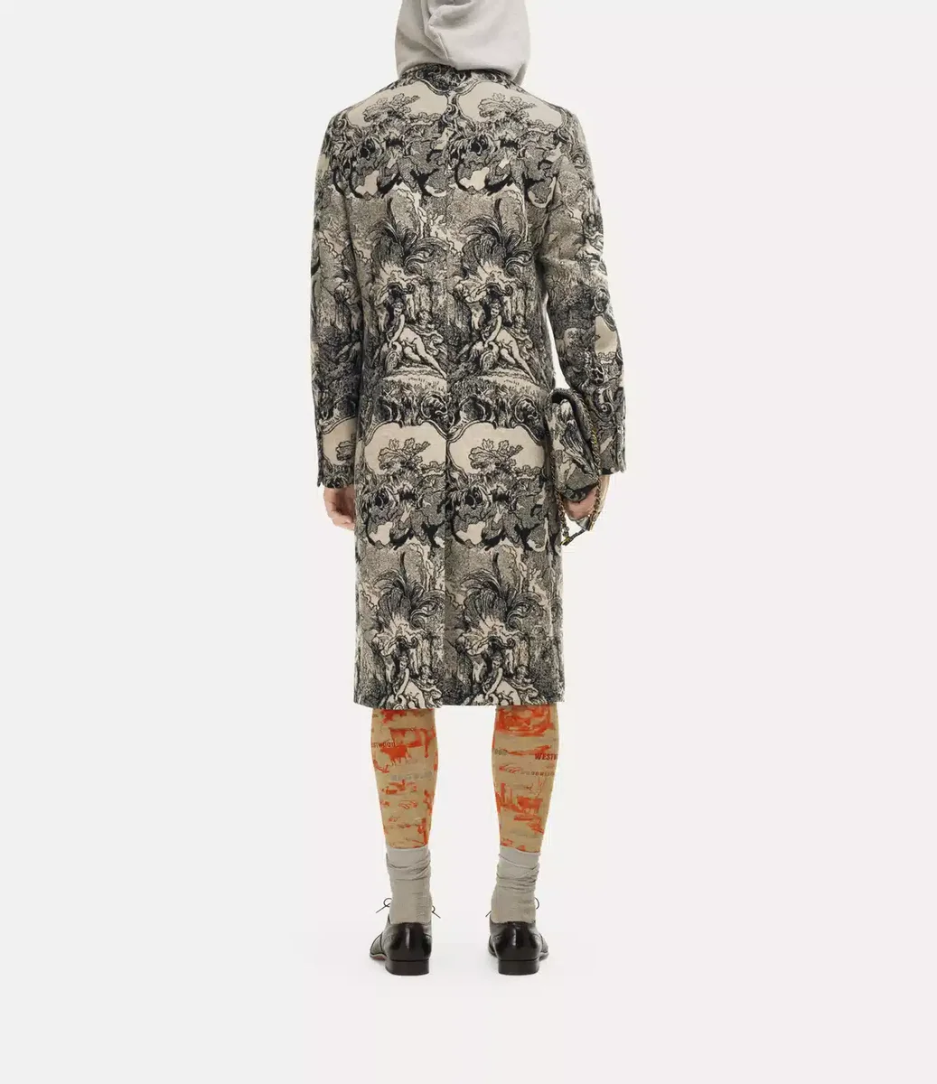 Il nostro cappotto classico doppiopetto è realizzato in ricca lana spazzolata e presenta il jacquard monocromatico “Venus” di questa stagione, un omaggio all’ammirazione di Vivienne per la storia dell’arte. Progettato con spalle strutturate e ampi revers, il capo cade in una raffinata silhouette al ginocchio.