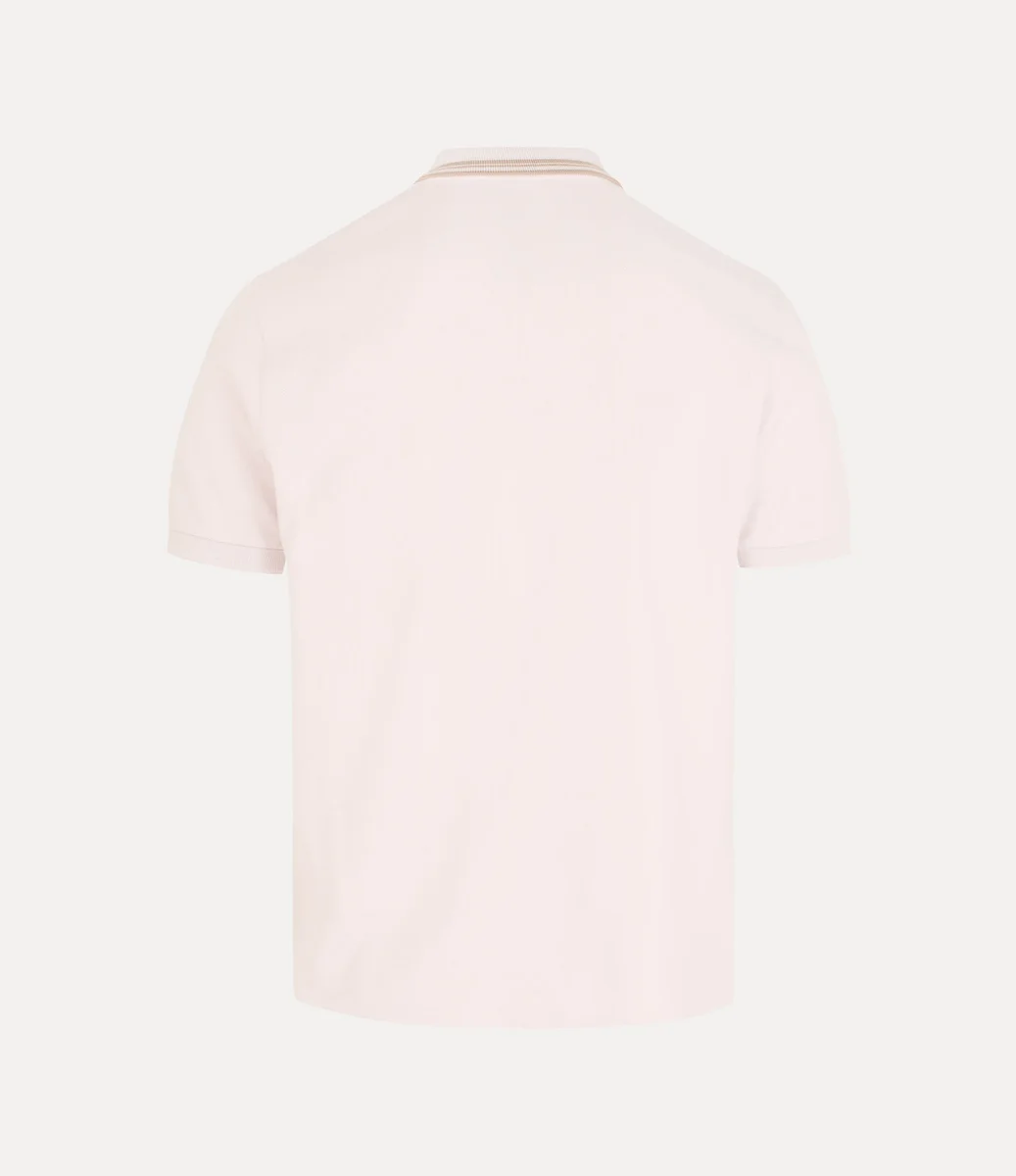 La nostra polo Classic è stata rivisitata in questa stagione con bottoni in madreperla lucida e dettagli a righe sul colletto. Realizzata in morbido cotone, presenta un motivo orb ricamato sul lato sinistro del petto, che simboleggia la tradizione, circondato dagli anelli celesti di Saturno, che rappresentano il futuro.