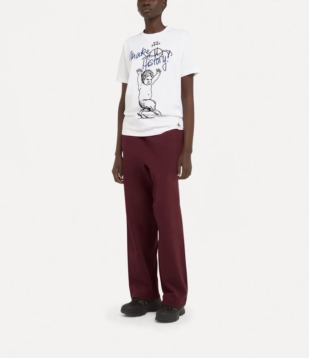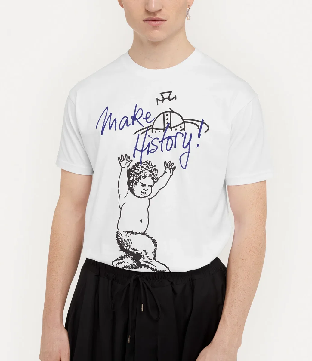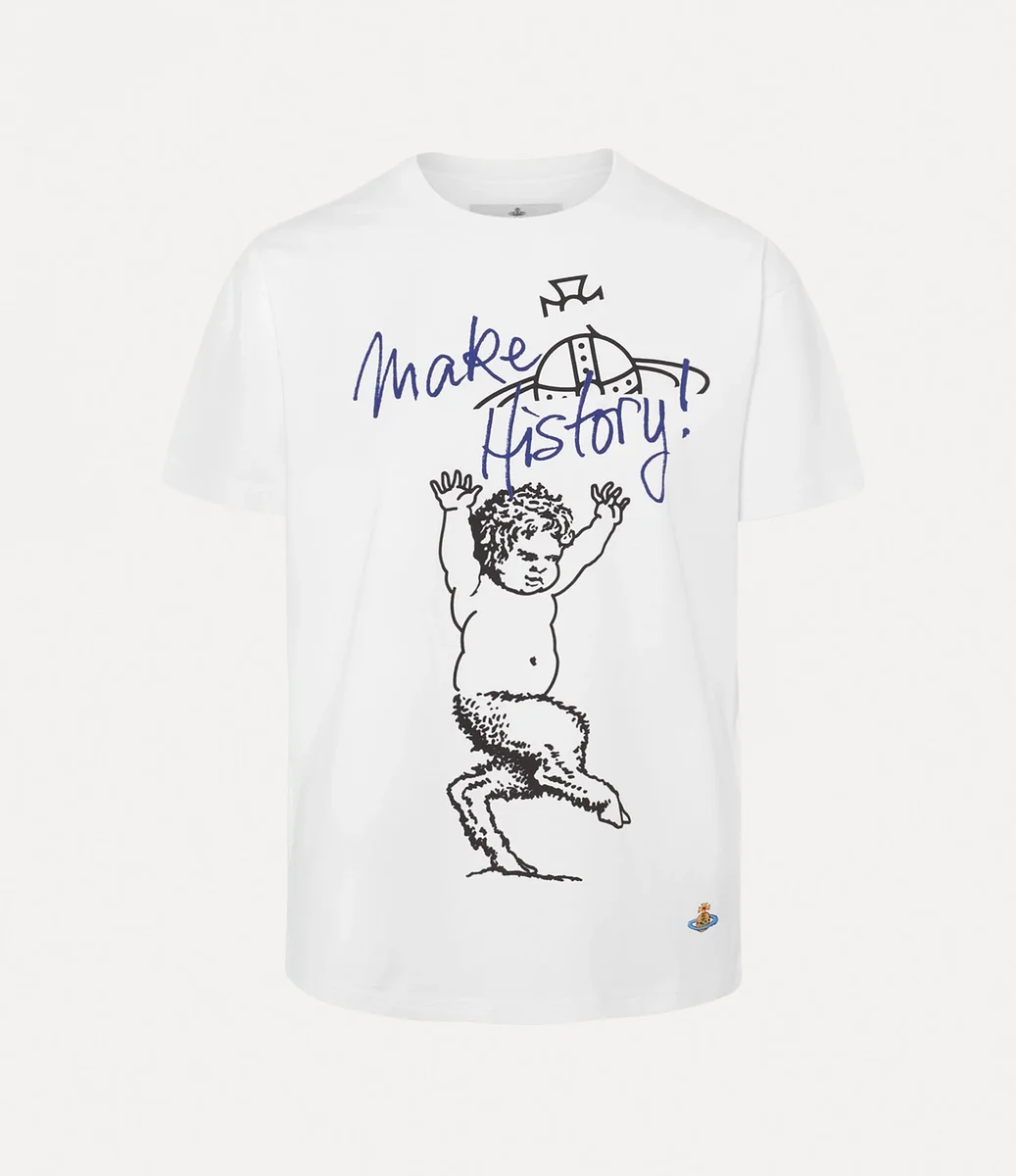 La t-shirt Fawn Classic presenta un girocollo, impreziosito da dettagli a costine sui bordi per un finish classico. Il capo presenta il motivo “Fawn” della maison, apparso per la prima volta nella collezione Autunno-Inverno 2002 “Anglophilia”, completato dallo slogan “Make History”, che riprende uno dei messaggi chiave di Vivienne sul cambiamento climatico.