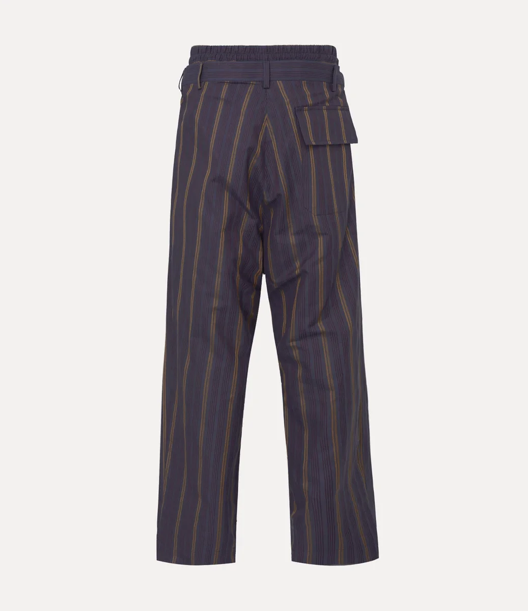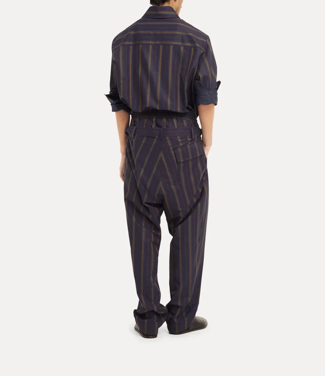 I nostri pantaloni Builder tornano in questa stagione con una finitura in cotone a righe e un dettaglio ricamato sul fianco. Caratterizzati da una doppia cintura distintiva, il design utilizza il sistema sartoriale sperimentale “Builder” di Vivienne, introdotto per la prima volta nella collezione Autunno-Inverno 2014-15, “Save the Rainforest”.
