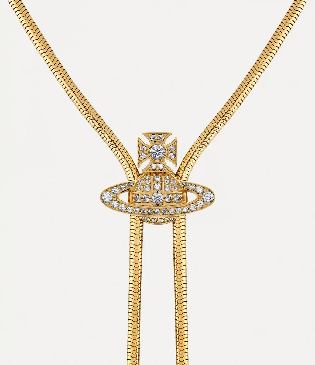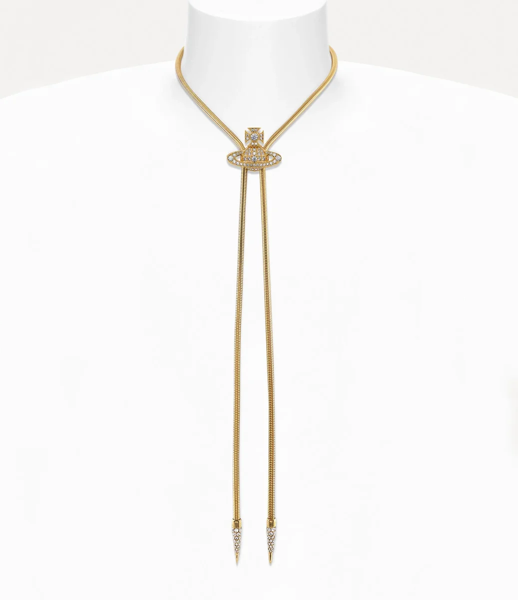 La nostra cravatta Bolo color oro si ispira al motivo a sfera distintivo della maison, con dettagli in cristallo pavé. Realizzata con un’elegante catena a serpente e punte in cristallo appuntite, il design può essere regolato a diverse lunghezze facendo scorrere il centro della sfera per una vestibilità personalizzata.