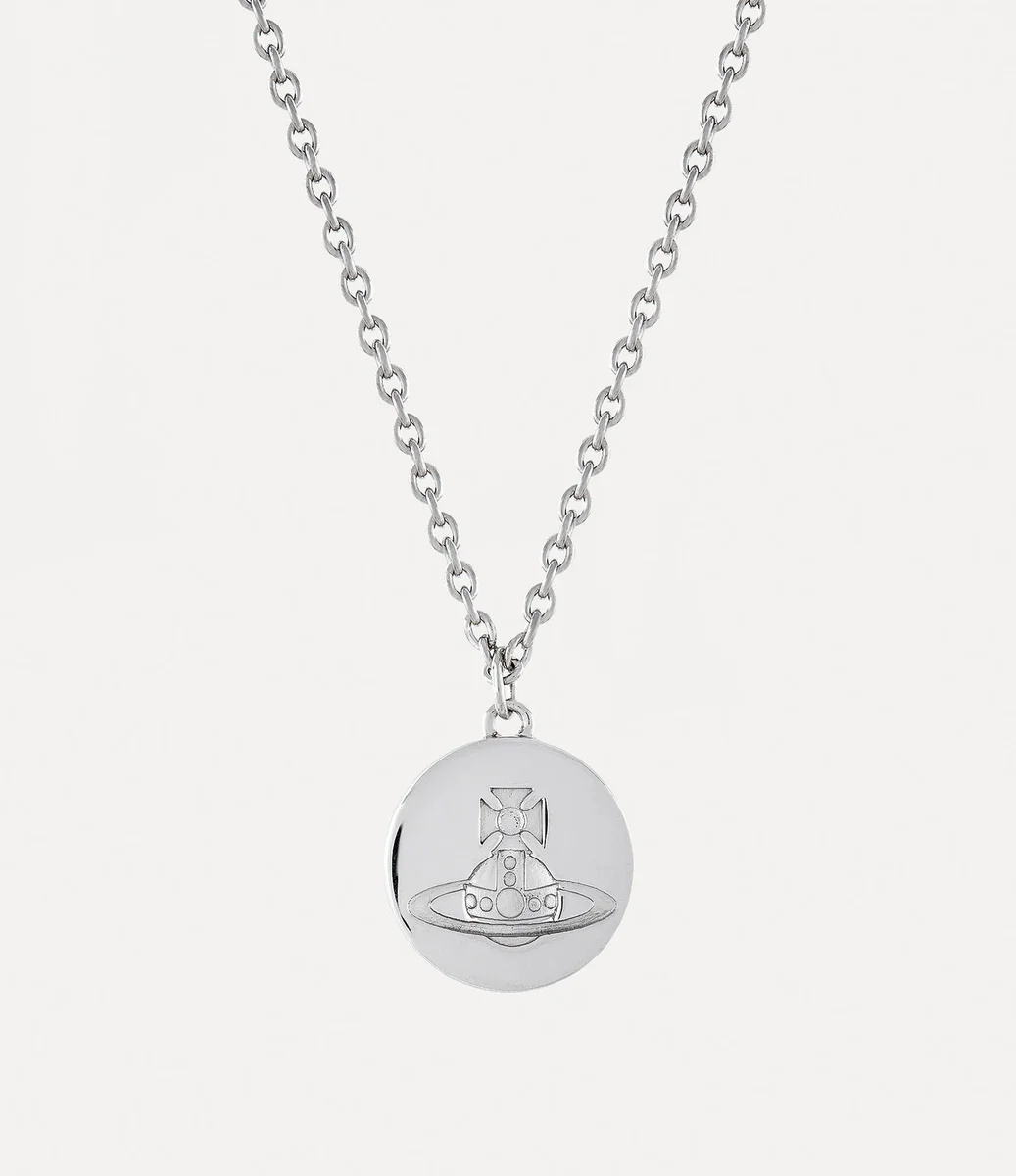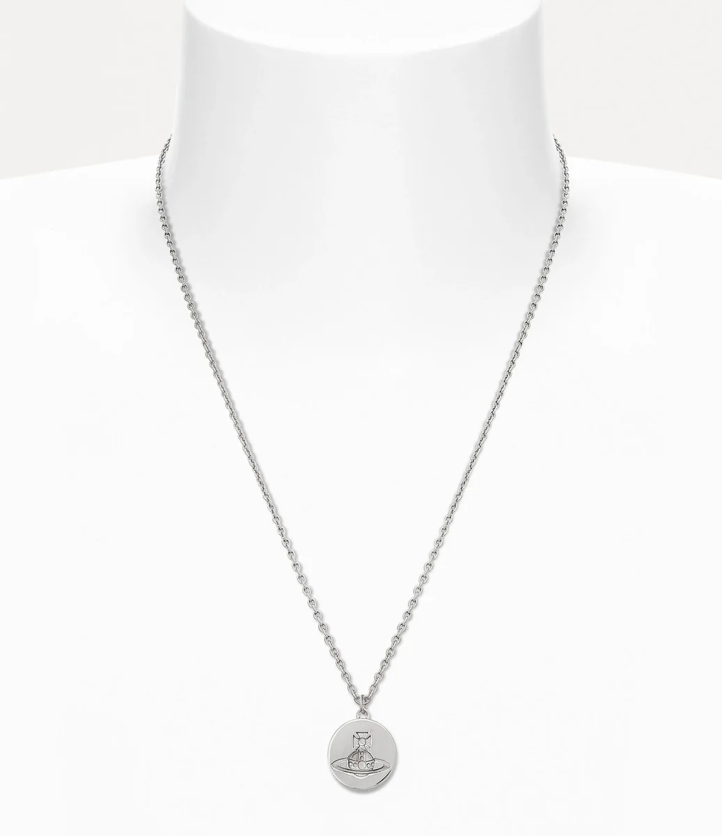 La collana con pendente Man. Janus presenta una finitura in argento placcato platino, modellata per formare un’intricata silhouette ovale. Il gioiello presenta un design interamente in metallo, completato da un motivo con lettere incise sul retro, mentre sul davanti è presente un globo in rilievo, sinonimo della filosofia della maison di collegare il passato al futuro.