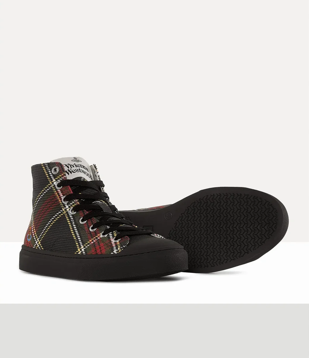 Vivienne Westwood Sneakers alte in tessuto Chelsea tartan dai toni tenui di questa stagione, con il nostro globo ricamato sulla caviglia e la classica silhouette in tela.